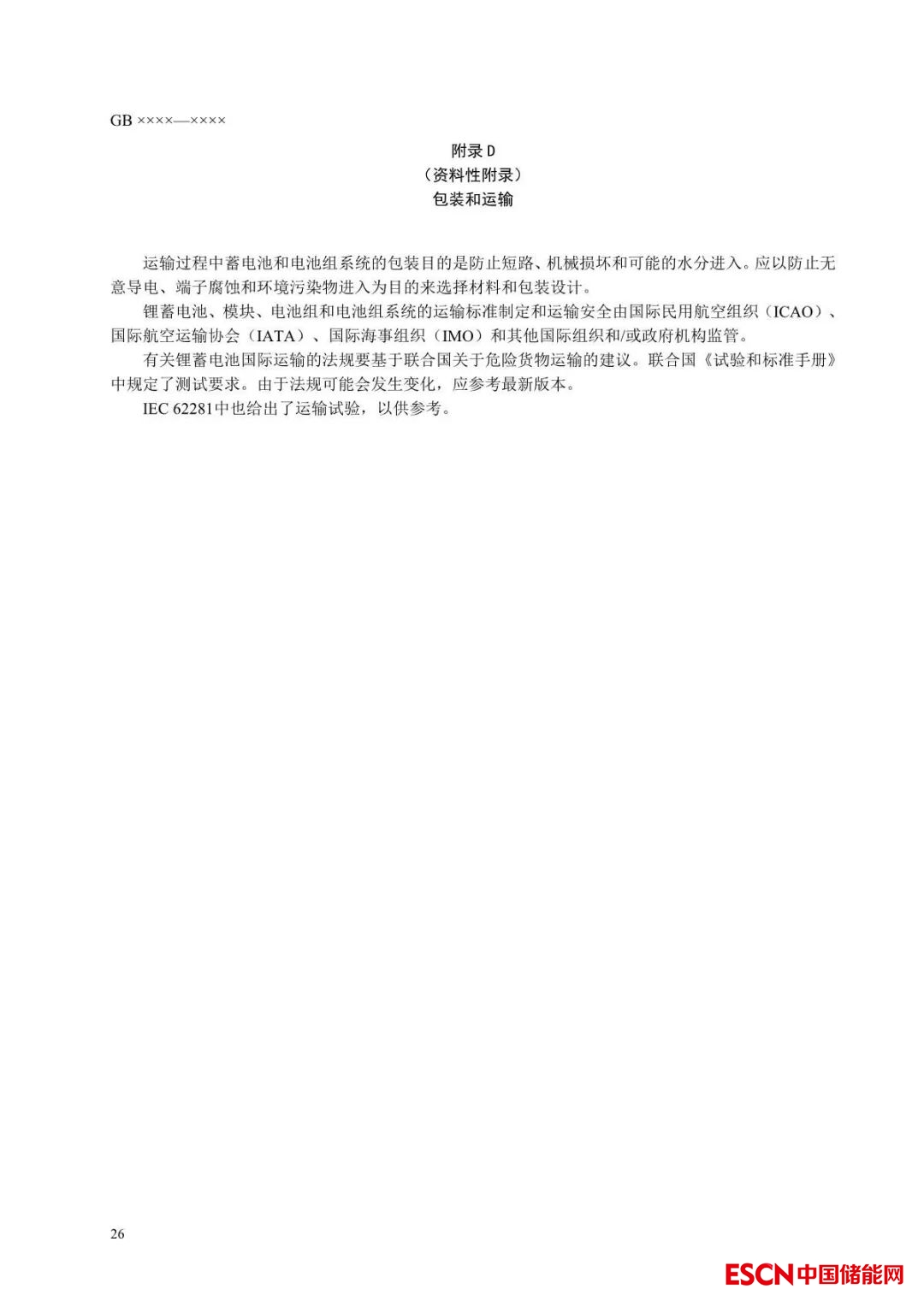 该文件适用于电能存储系统用锂蓄电池和电池组(以下简称为电池和电池组)。其中电能存储系统包括:电信;中央应急照明和报警系统;固定式发动机启动;光伏系统;家用(住宅)储能系统(HESS);大容量储能:并网/离网。