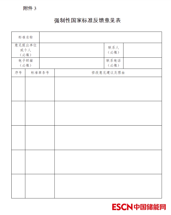 如有不同意见,请在公示期间填写《强制性国家标准反馈意见表》(见附件3),通过电子邮件发送至KJBZ@miit.gov.cn(邮件主题注明:《电能存储系统用锂蓄电池和电池组安全要求》等3项强制性国家标准征求意见稿公示反馈)。