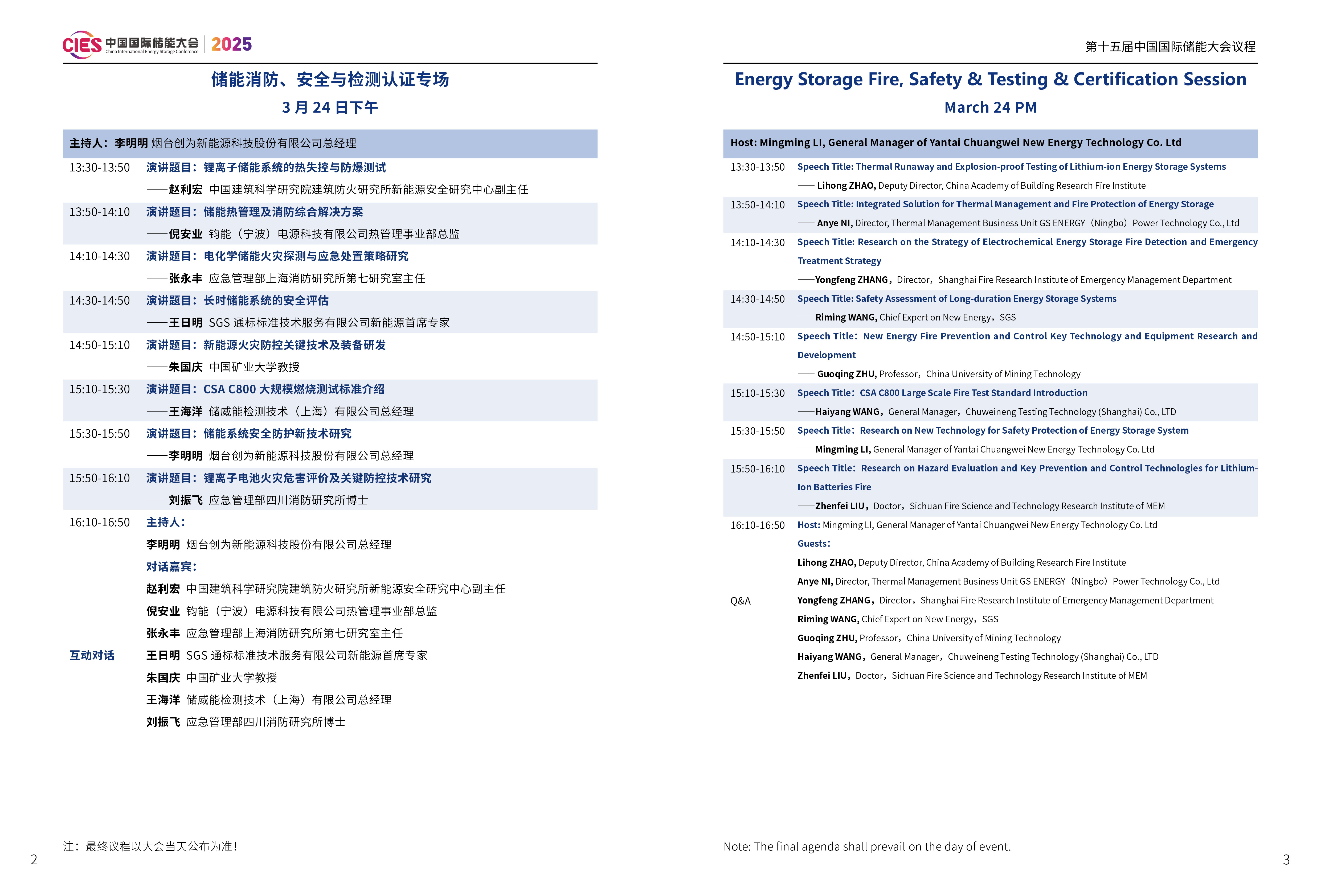 CIES2025储能大会将设置:大会开幕式暨特邀院士专家报告、数智化配电网与新型储能融合创新、新型电力系统与并网调度、新型储能与新能源大基地协同发展、国际储能、电力辅助服务、现货交易及容量市场、工业绿色微电网、国家储能标准宣贯、数智化新型储能系统集成解决方案(上、下)、储能消防、安全与检测认证、新型储能资本与投资、液流电池与长时储能、混合储能、2025 新型储能系列研究报告暨行业百强发布、全球化新型储能供应链机遇与挑战、数智化工商业储能解决方案与商业案例、虚拟电厂与车网互动、海外储能渠道开发与商业机遇、构网型储能系统及项目建设、储能专用电池与ESG、新品发布会等23个专场,以下为储能消防、安全与检测认证专场议程(最终议程以大会当天发布为准)。