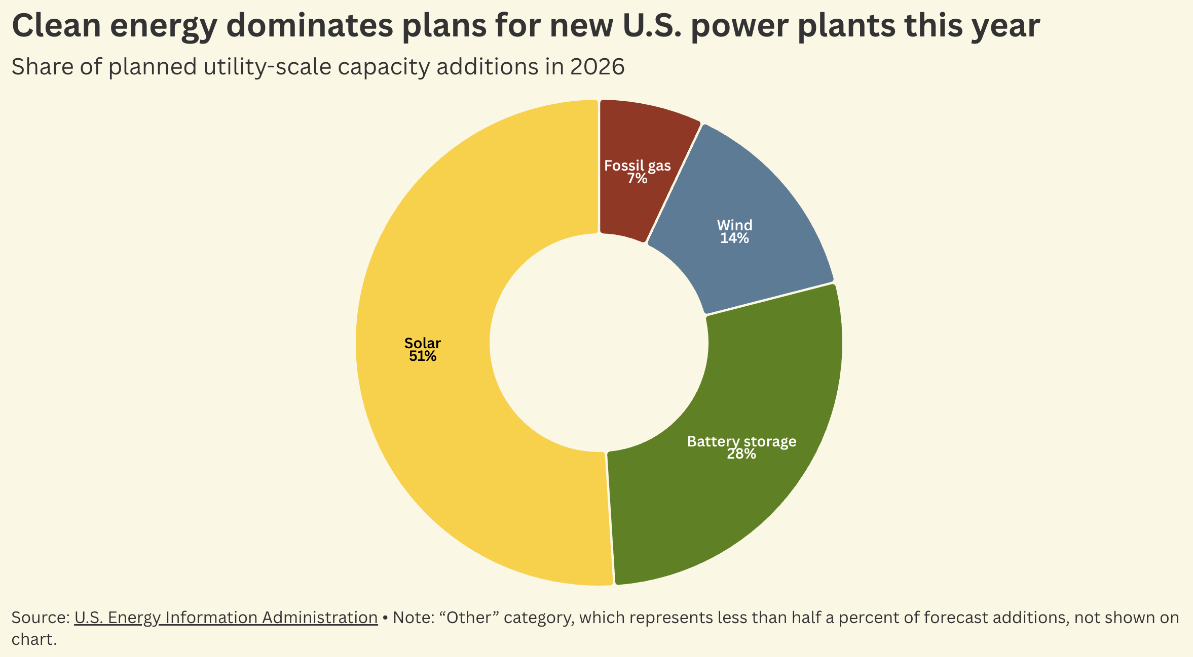 美国能源信息署的数据显示,2026年计划并网的公用事业级新增发电装机中,太阳能占比51%,储能电池占28%,风电占14%。而特朗普政府最为支持的高污染能源——化石天然气,其新增装机占比仅为7%。美国白宫青睐的另一类高污染能源煤炭,甚至未出现在在建发电厂的名单中。