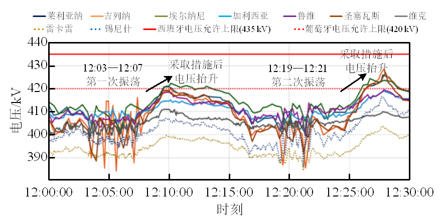 第二次振荡(区域振荡)。12:19-12:22,半岛发生了第二次功率振荡,这是欧洲电网典型的区域间振荡模式,振荡主频率为0.21Hz,主要表现为半岛机组与欧洲大陆机组之间的振荡。西班牙REE又按照预先制定的措施来抑制振荡:1)投入西班牙南部的400kV输电线路;2)进一步减少向法国的输送功率;3)减少向葡萄牙的输送功率;4)切除并联电抗器等操作。采取措施后进一步抬高了系统电压,400kV变电站的电压最大值接近430kV,明显高于第一次振荡后电压最高值,如图1所示。