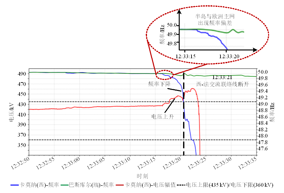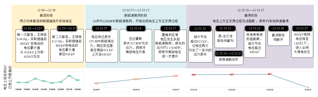 12:33:24,半岛电网崩溃,西班牙和法国之间的高压直流输电线路停止运行;12:33:27,400kV电网电压降至1kV以下,半岛进入全网大停电状态。