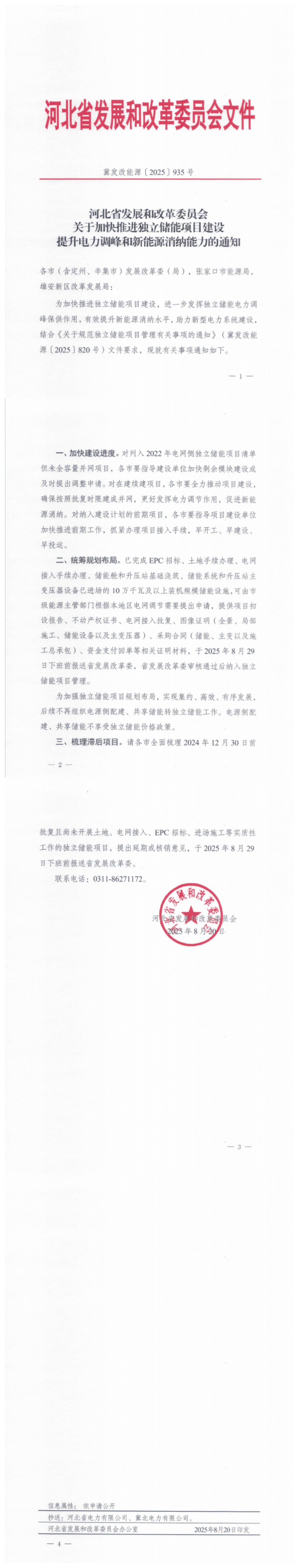 数字储能网讯:近日,河北省发展和改革委员会发布《关于加快推进独立储能项目建设提升电力调峰和新能源消纳能力的通知》。