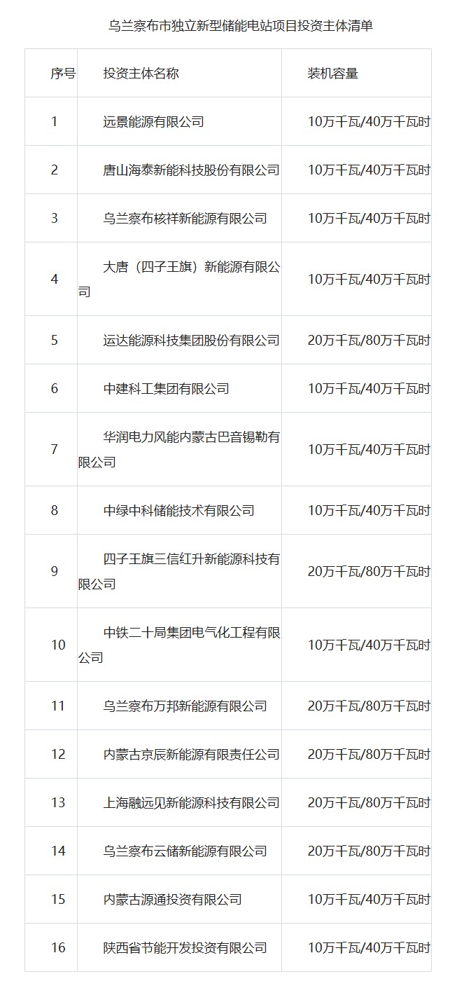 远景能源有限公司、唐山海泰新能科技股份有限公司、乌兰察布核祥新能源有限公司、大唐(四子王旗)新能源有限公司、中建科工集团有限公司、华润电力风能内蒙古巴音锡勒有限公司、中绿中科储能技术有限公司、中铁二十局集团电气化工程有限公司、内蒙古源通投资有限公司、陕西省节能开发投资有限公司中选规模均为100MW/400WMh。