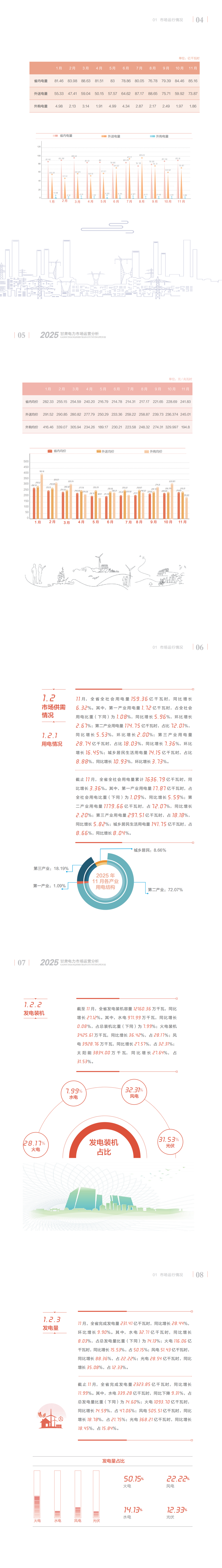 截至11月底,共注册市场主体 8603家,其中,发电企业1655家(火电48家,水电834家,风电264家,光伏487家,风光电厂5家,其他发电17家);电力用户6565家(批发用户302家,零售用户6263家),售电公司349家(在甘注册87家,外省推送264家),独立储能企业18家;辅助服务聚合商12家,电网公司1家,虚拟电厂2家。