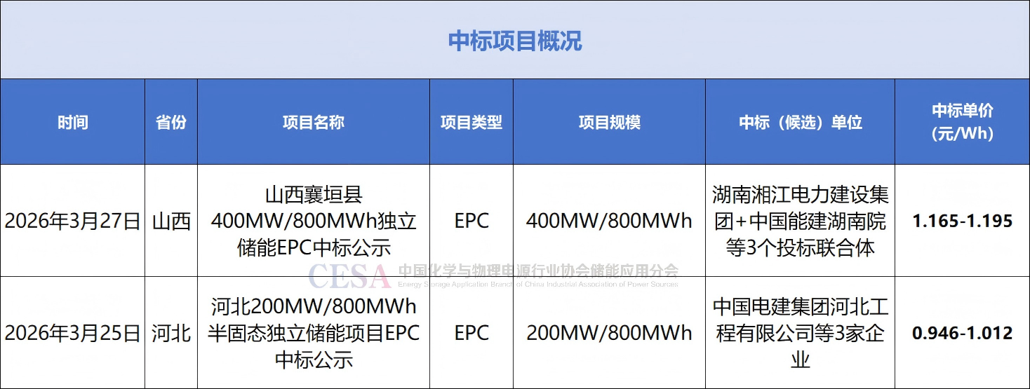中标方面, 3月27日,山西襄垣县400MW/800MWh独立储能项目总承包(EPC)中标候选人公示,湖南湘江电力建设集团+中国能建湖南院等3个投标联合体入围,投标单价约为1.165-1.195元/Wh;3月25日,河北200MW/800MWh半固态独立储能项目EPC工程总承包中标候选人公示发布,中国电建集团河北工程有限公司等3家企业入围,报价区间0.946-1.012元/Wh。