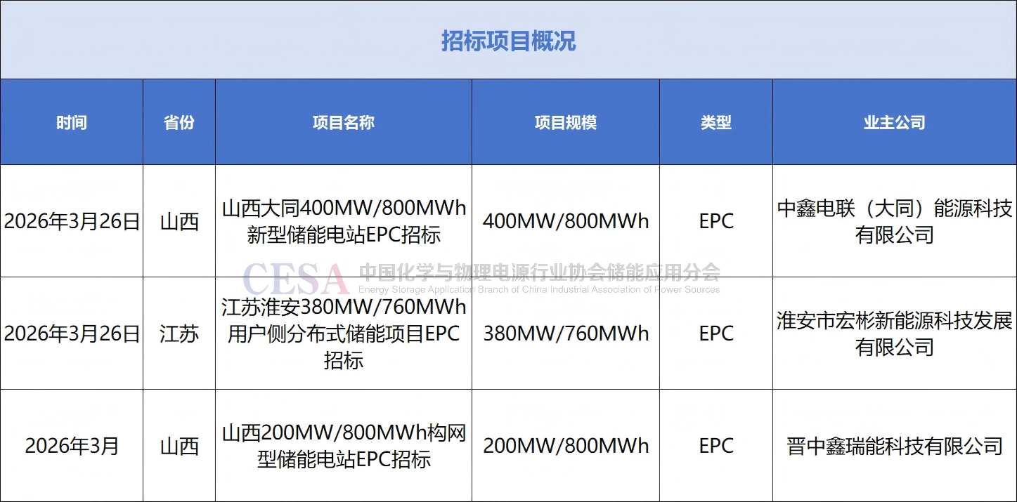 招标方面,3月26日,山西大同400MW/800MWh新型储能EPC总承包招标公告发布;江苏淮安380MW/760MWh用户侧分布式储能EPC招标公告发布;山西晋中和顺200MW/800MWh共享构网型储能电站项目EPC发布招标公告。