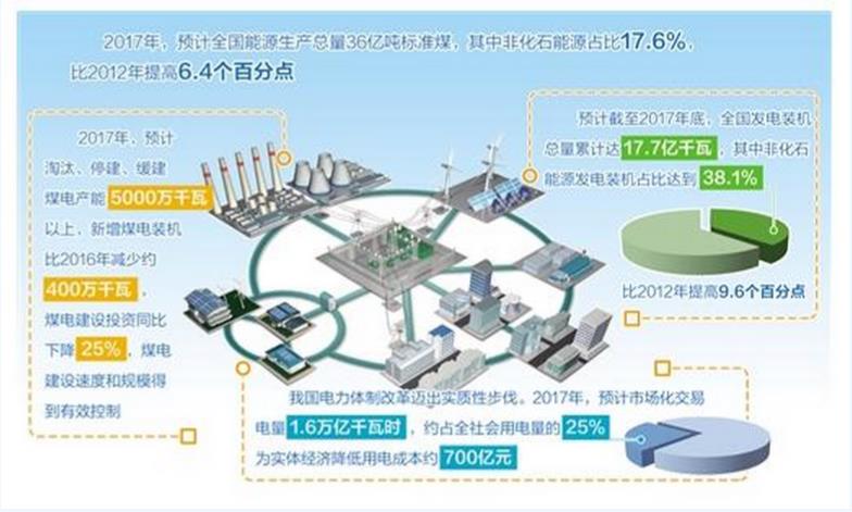 与此同时,煤炭去产能和防范化解煤电产能过剩风险取得重要阶段性成果。2017年,预计淘汰、停建、缓建煤电产能5000万千瓦以上,新增煤电装机比2016年减少约400万千瓦,煤电建设投资同比下降25%,煤电建设速度和规模得到有效控制。